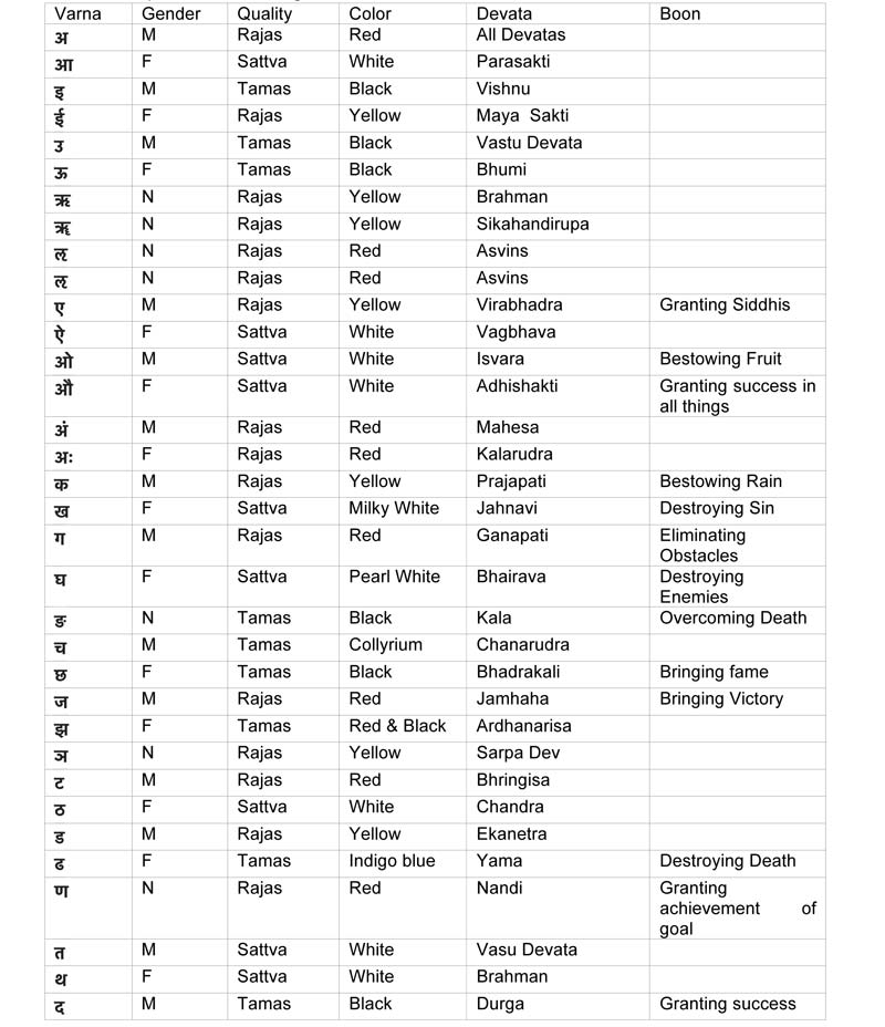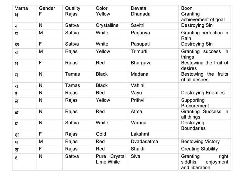 From the karikas we also know about the three gunas. If the person to be healed is tamasic or rajasic one can introduce appropriate mantras to elevate the person to satvik level. In appendix 2 I have provided a chart explaining the guna of Sanskrit alphabets, their associated colour etc. This is drawn from Varnamala. Appropriate savik guna alphabets can be used to derive mantras or bijas to elevate the person to sativk level. If the person can maintain savik nature during the healing process the chances of healing accelerating are better.